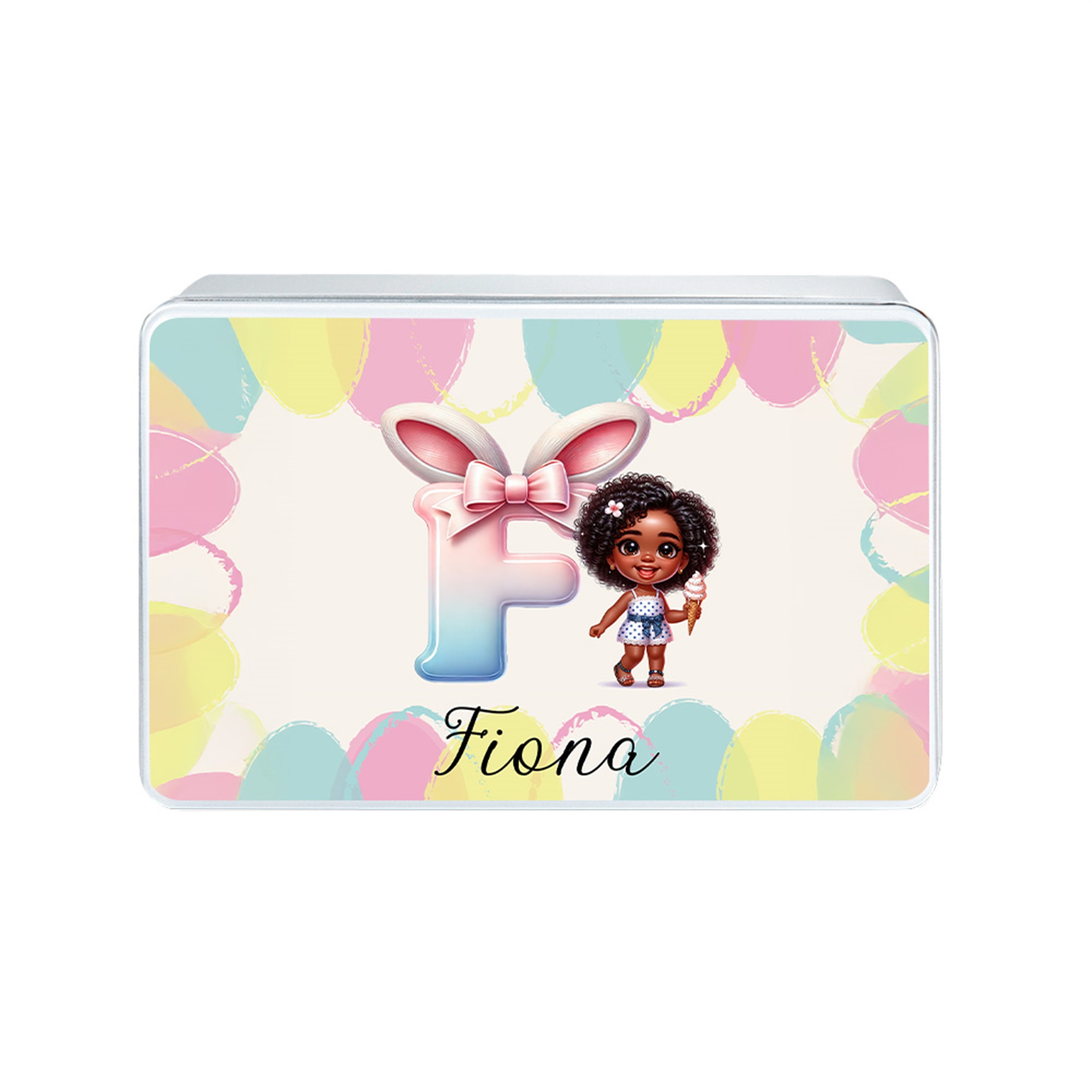Custom Name Cartoon Afro Little Girl Bunny Ears Bow Alphabet Treat Tin with Lid, Biscuit Candy Box, Tinplate Container, Birthday/Easter Gift for Girls