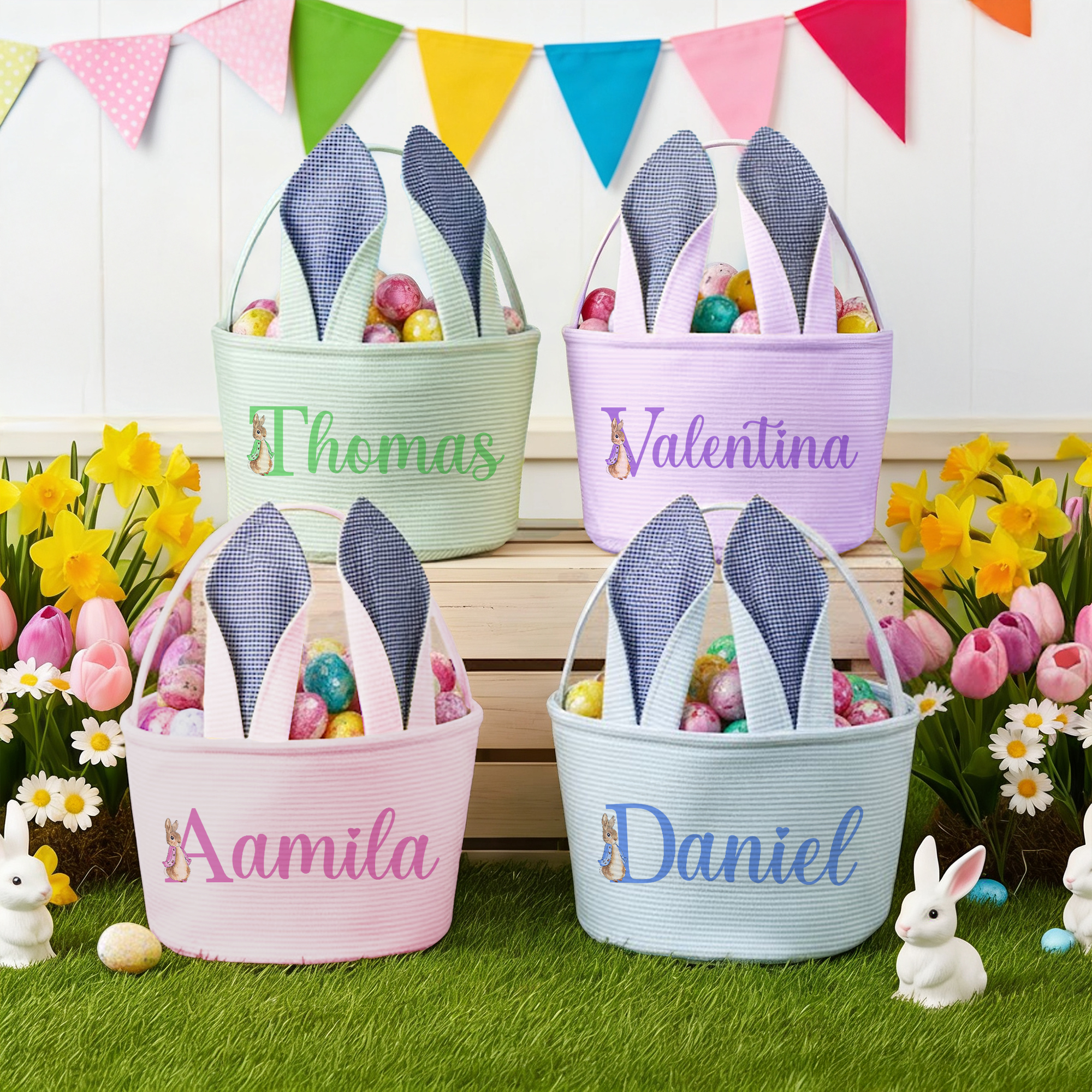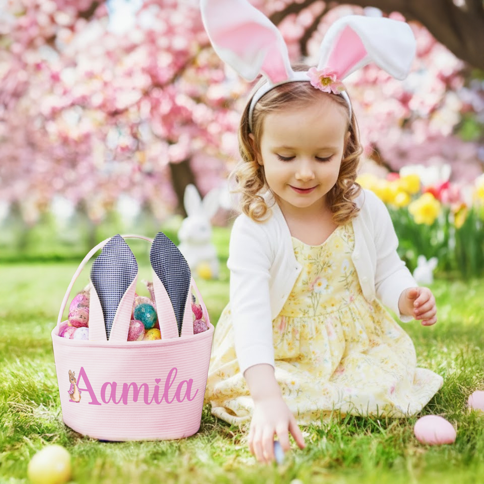 Custom Name Peter Rabbit Alphabet Easter Basket with Bunny Ears