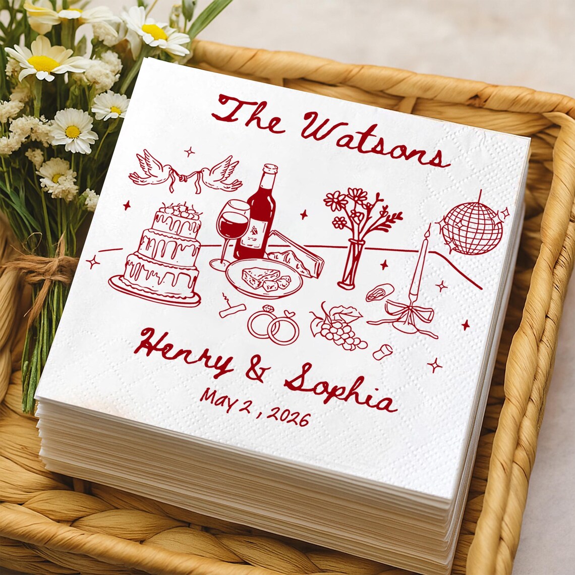 Wedding Cocktail Napkins – These elegant white napkins feature a charming illustration of wedding essentials—cake, wine, rings, flowers, and more. At the top, your family name is printed in graceful script, with a couple of names and a date below, making each one a special keepsake.