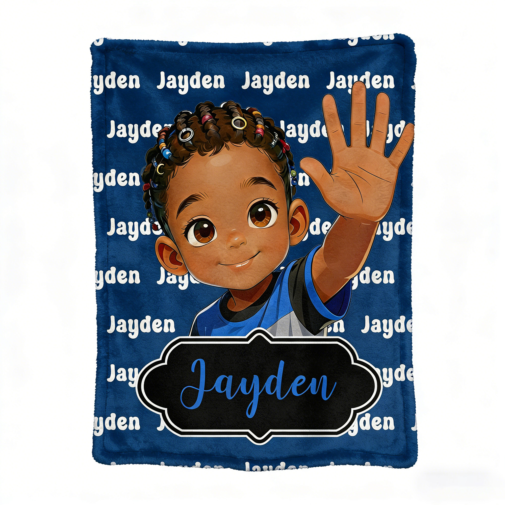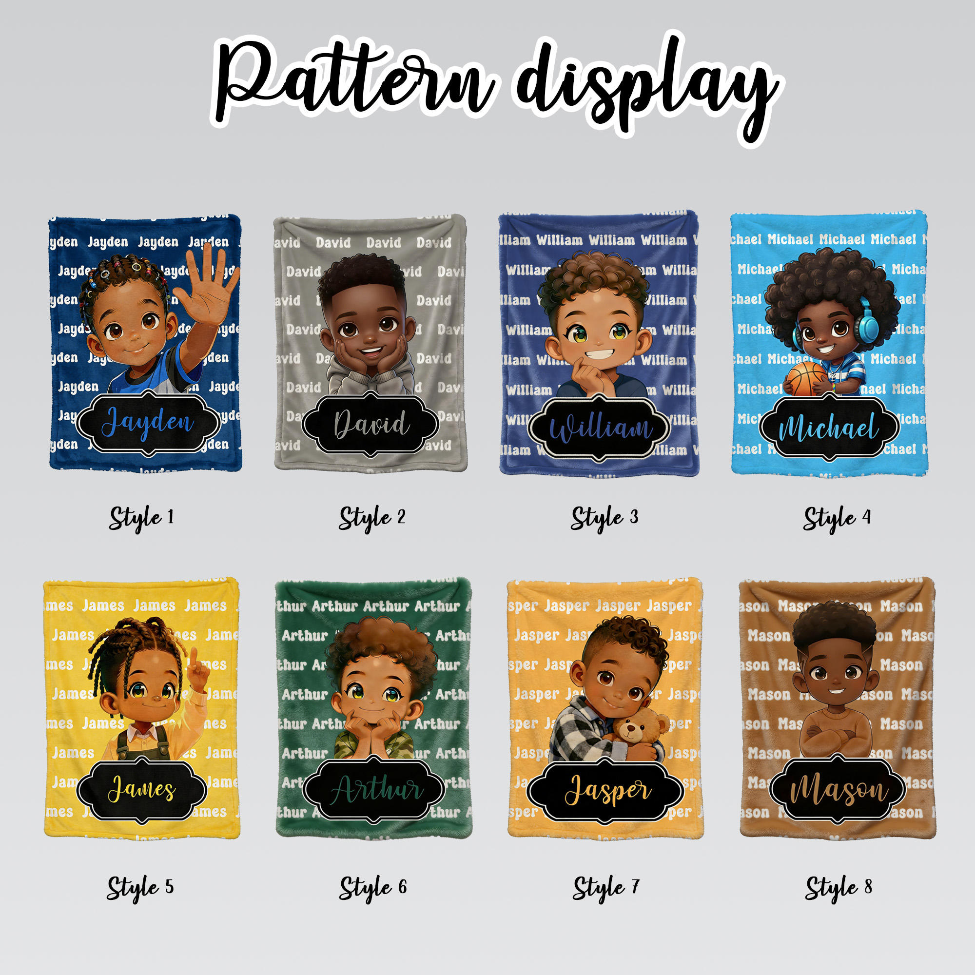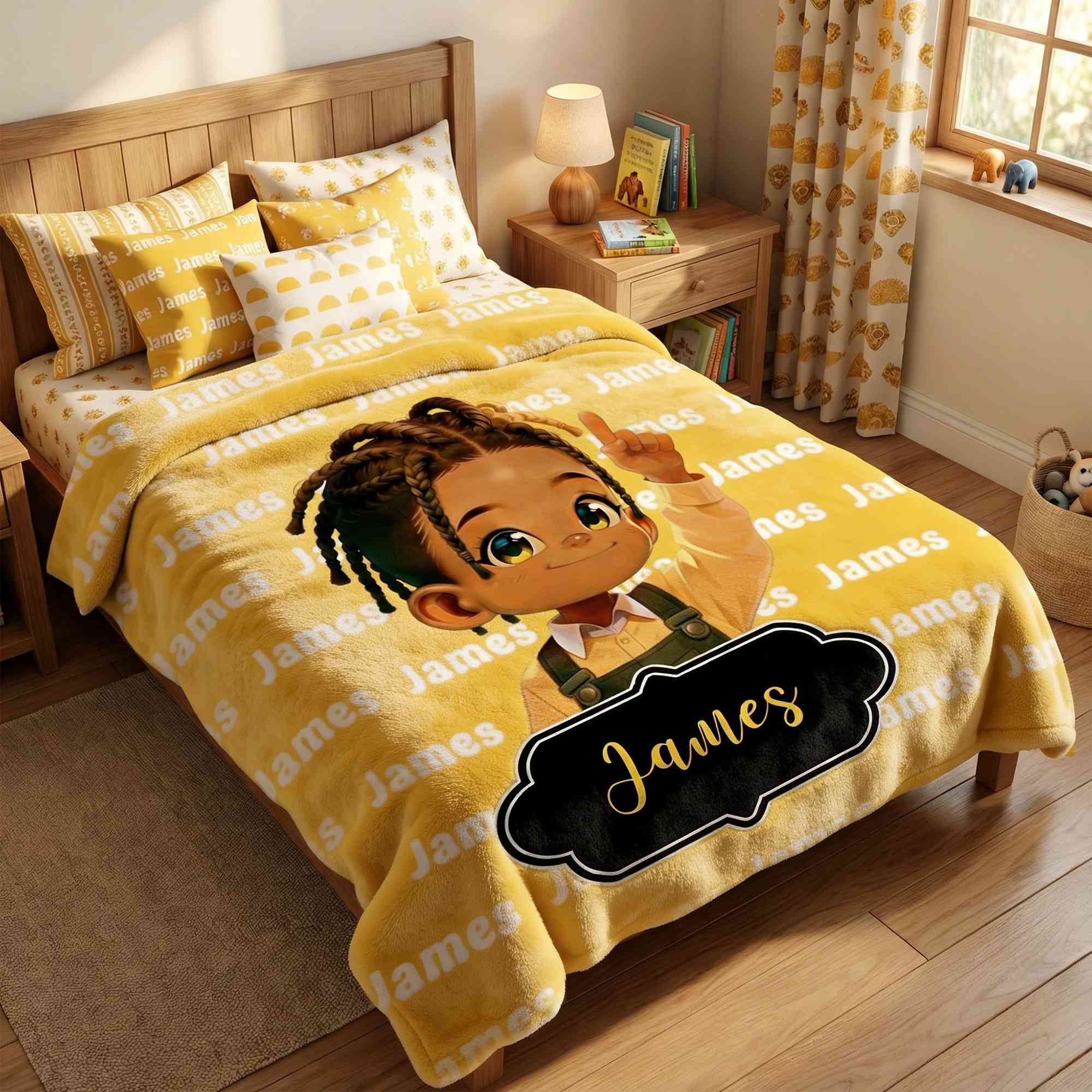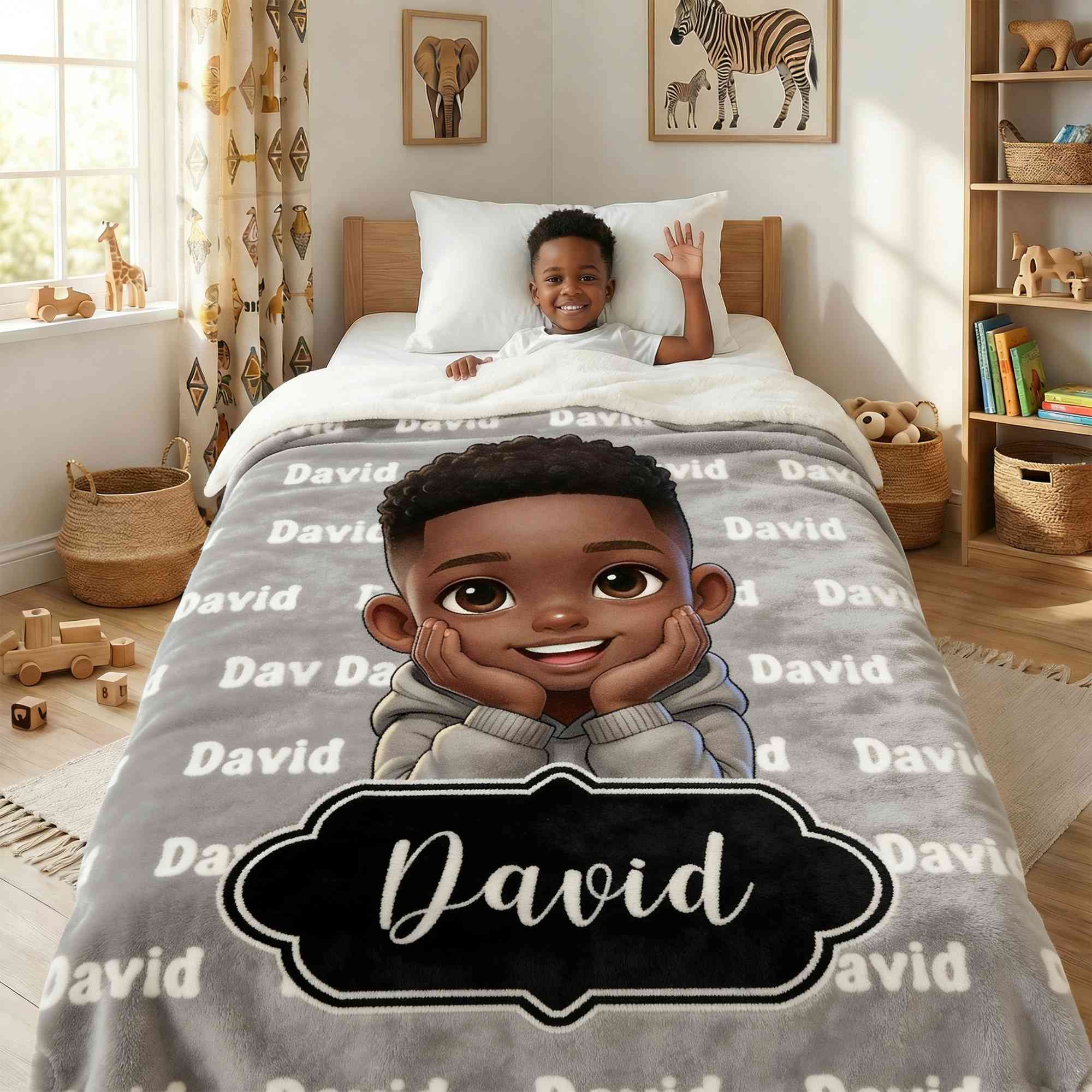 Playful Cartoon Design - This blanket features a cute cartoon Afro Black boy with bright colors and a cheerful look. The multicolor artwork celebrates African American culture and brings warmth, confidence, and joy to a child’s room, bed, or couch.